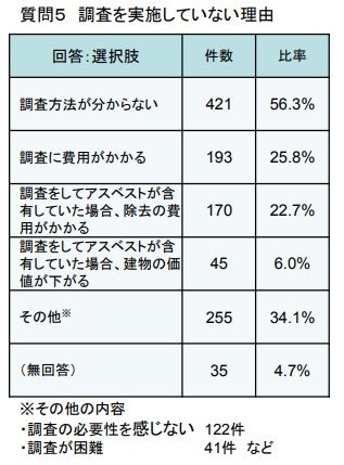 また、アスベストの事前調査を実施しない主な理由として、「調査方法がわからない(56.3%)」に次いで、「調査に費用がかかる(25.8%)」「調査をしてアスベストが含有していた場合、除去の費用がかかる(22.7%)」という費用負担に関する回答が多く見られました(※図2)。