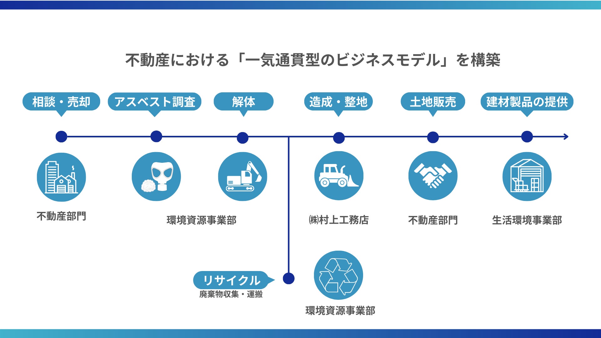 建物の解体や土地整備が必要な不動産事業に、産業廃棄物の適正処理・リサイクルや解体を行う環境資源事業部と、土木工事を行うグループ会社の村上工務店(広島県広島市)との連携を強化させ、一貫したプロセスを構築。これにより円滑な事業推進を提供していきます。