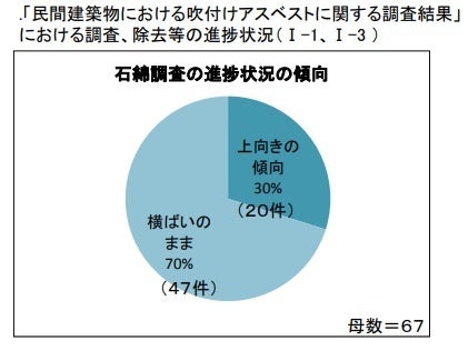 平成27年度に国土交通省が実施した、アスベスト対策の現状・課題を把握するための地方公共団体等に対するアンケート調査によると、建築物所有者における調査、除去等の進捗が停滞していると感じていることがわかります(※図1)。